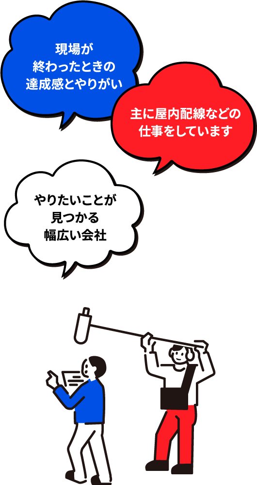 工事の準備、打ち合わせ、現場作業、竣工まで、すべての工程に携わるので大変なこともありますが、現場が無事に終わったときには大きな達成感とやりがいを感じます。